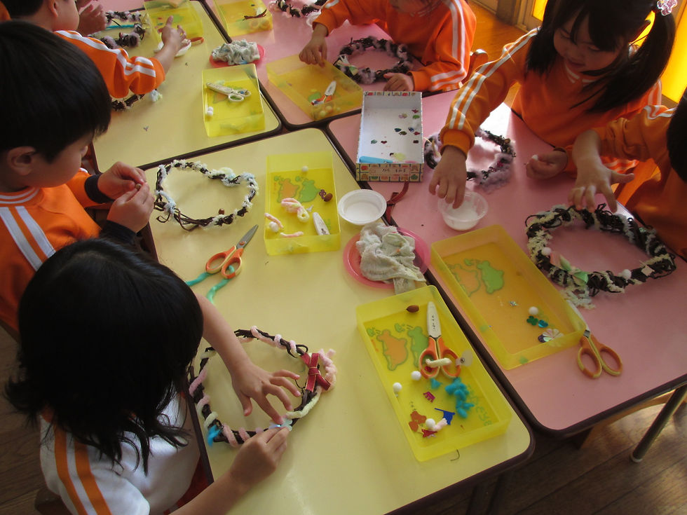 たのしみ会を終えた子どもたちと先生はゆったりと過ごしています。今日は、おいもほりでのつるを使ってクリスマスリースを作りました。毛糸やリボンを巻いたり、どんぐり、スパンコールなど子どもたちが思い思いに飾り付けました!とっても素敵なリースができました。クリスマスが待ち遠しいです❣今週で2学期が終了します。みんな元気に来られますように。